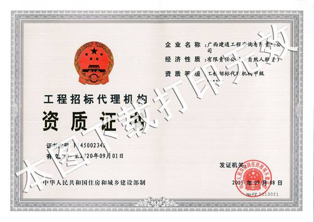 在集團(tuán)、公司領(lǐng)導(dǎo)的關(guān)心、支持以及品牌公司資質(zhì)申報(bào)全體人員的共同努力下,我集團(tuán)旗下子公司廣西建通工程咨詢有限責(zé)任公司于2015年9月8日成功取得由中華人民共和國(guó)住房和城鄉(xiāng)建設(shè)部頒發(fā)的工程招標(biāo)代理機(jī)構(gòu)甲級(jí)資質(zhì)證書延續(xù)。廣西建通工程咨詢有限責(zé)任公司擁有一支技術(shù)能力強(qiáng)、專業(yè)程度高的招標(biāo)代理人才隊(duì)伍,致力于為業(yè)主提供優(yōu)質(zhì)的招標(biāo)代理服務(wù),公司的招標(biāo)業(yè)務(wù)涉及房建、市政、橋梁、水利、公路等多個(gè)領(lǐng)域,囊括土木工程、建筑工程、線路管道和設(shè)備安裝工程及裝飾裝修工程的勘察、設(shè)計(jì)、施工、監(jiān)理以及與工程建設(shè)有關(guān)的重要設(shè)備、材料采購招標(biāo)的代理業(yè)務(wù),此次工程招標(biāo)代理甲級(jí)資質(zhì)延續(xù)的取得為公司招標(biāo)代理業(yè)務(wù)的拓展提供了更廣闊的空間,為公司從區(qū)域公司轉(zhuǎn)型為全國(guó)性公司奠定了堅(jiān)實(shí)的基礎(chǔ)。公司將珍惜榮譽(yù),為實(shí)現(xiàn)集團(tuán)全國(guó)品牌發(fā)展戰(zhàn)略保駕護(hù)航!