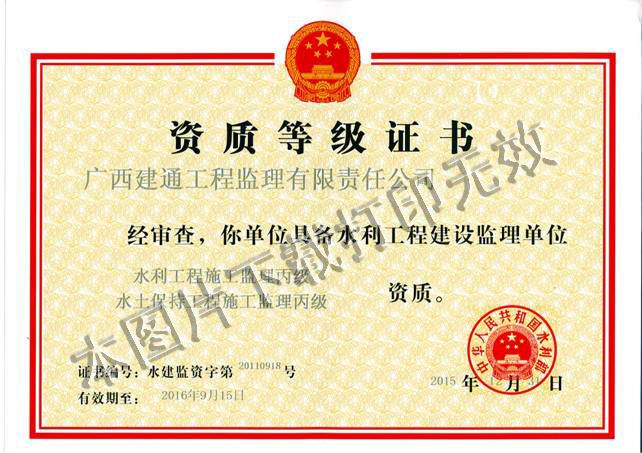 集團(tuán)公司近來好消息接憧而至,2016年1月8日,中華人民共和國水利部網(wǎng)站發(fā)布公告,廣西建通工程監(jiān)理有限責(zé)任公司申請(qǐng)的水土保持工程施工監(jiān)理專業(yè)丙級(jí)資質(zhì)已經(jīng)通過審批,今后我集團(tuán)可承攬的水利監(jiān)理業(yè)務(wù)有:承擔(dān)Ⅲ等水土保持工程的施工監(jiān)理業(yè)務(wù)、Ⅲ等(堤防3級(jí))以下各等級(jí)水利工程的施工監(jiān)理業(yè)務(wù)。