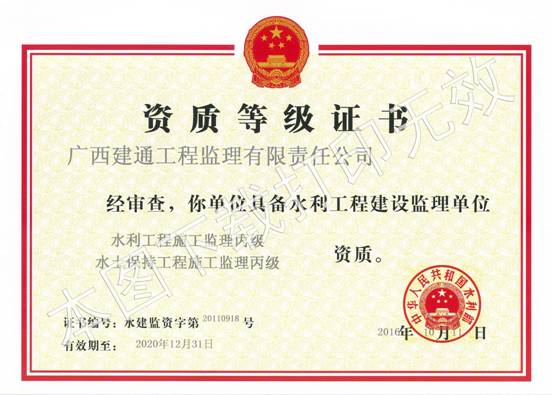 2016年10月14日,據(jù)中華人民共和國水利部網(wǎng)站發(fā)布的公告:廣西建通工程監(jiān)理有限責(zé)任公司成功辦理水利工程施工監(jiān)理丙級(jí)資質(zhì)延期。