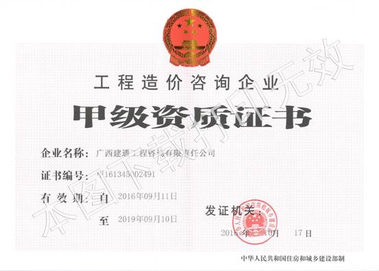 廣西建通工程咨詢有限責(zé)任公司根據(jù)《工程造價(jià)咨詢企業(yè)管理辦法》,以及《住房城鄉(xiāng)建設(shè)部辦公廳關(guān)于甲級(jí)工程造價(jià)咨詢企業(yè)資質(zhì)審核有關(guān)事項(xiàng)的通知》要求,工程造價(jià)咨詢企業(yè)資質(zhì)證書有效期滿后,向上級(jí)主管部門廣西住房城鄉(xiāng)建設(shè)廳、中華人民共和國住房城鄉(xiāng)建設(shè)部提交資質(zhì)延續(xù)申請(qǐng)材料,經(jīng)過審批后于2016年10月17日頒發(fā)新資質(zhì)證書, 證書情況如下: