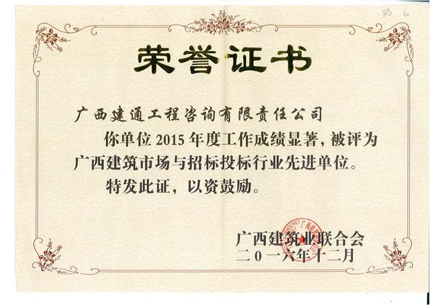 二〇一七年一月六日,廣西建筑業(yè)聯(lián)合會建筑市場與招標(biāo)投標(biāo)研究分會2016年年會暨表彰大會在南寧市鳳凰大廈隆重舉行,我集團(tuán)旗下子公司廣西建通工程咨詢有限責(zé)任公司作為理事會員單位及2015年度廣西建筑市場與招標(biāo)投標(biāo)行業(yè)先進(jìn)單位獲得者受邀參加了此次會議,我集團(tuán)副總裁謝乃鵬出席了本次會議并作為獲獎(jiǎng)單位代表接受了表彰和榮譽(yù)。