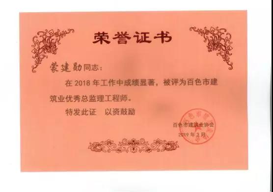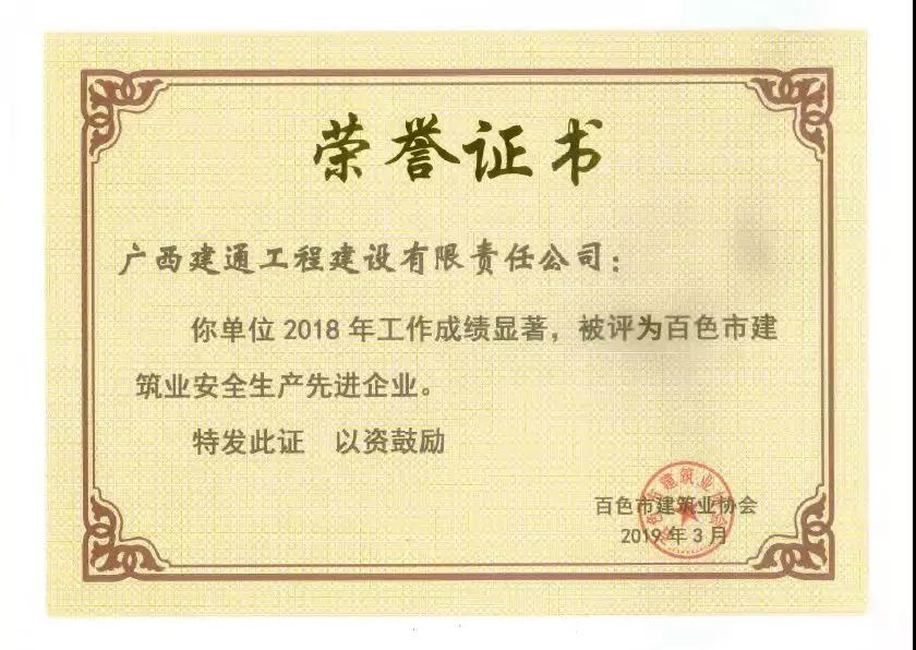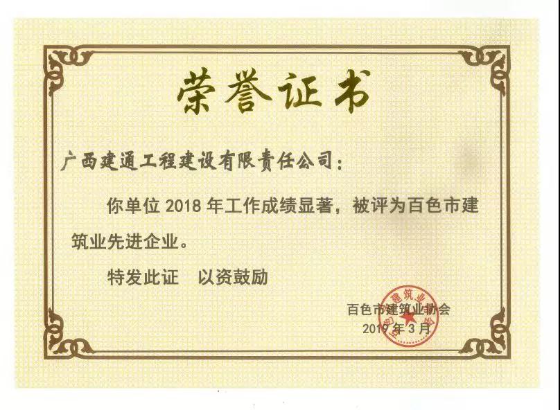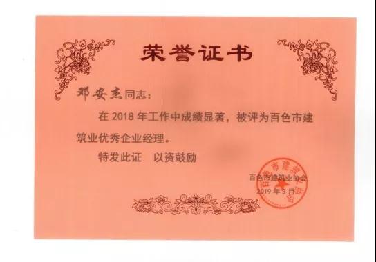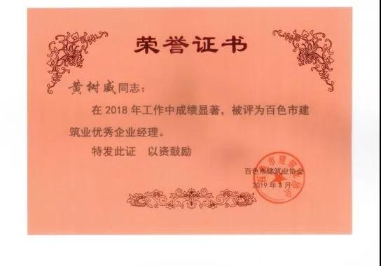 二、廣西建通工程建設(shè)有限責任公司榮獲《2018年度百色市建筑業(yè)先進企業(yè)》、《2018年度百色市建筑業(yè)質(zhì)量管理先進企業(yè)》、《2018年度百色市建筑業(yè)安全生產(chǎn)先進企業(yè)》、黃樹威副董事長榮獲《2018年度百色市建筑業(yè)優(yōu)秀企業(yè)經(jīng)理》榮譽稱號;