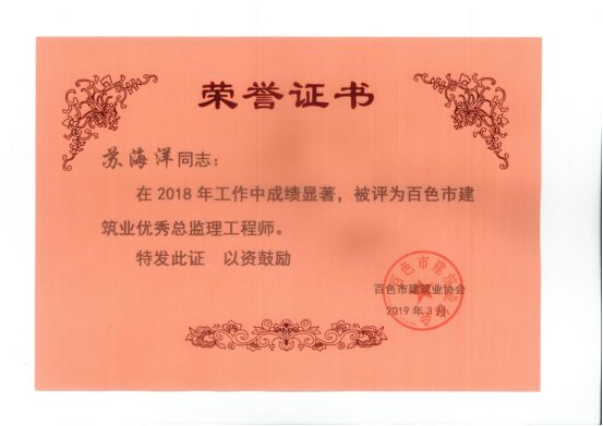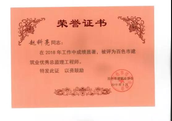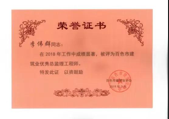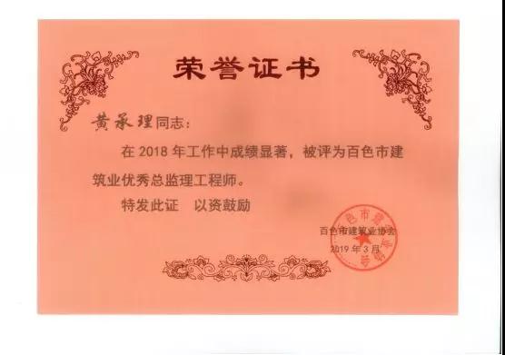 三、廣西建通工程監(jiān)理有限責任公司名下技術(shù)總監(jiān):劉忠志、蒙建勛、黃承理、趙科亮、麻建偉、盧貴修、黃慧妮、陳 垌、蘇海洋、羅愛梅、陳彩繡、黃林奧、莫慶華、李偉群、郭文保等15位榮獲《2018年度百色市優(yōu)秀總監(jiān)理工程師》榮譽稱號;