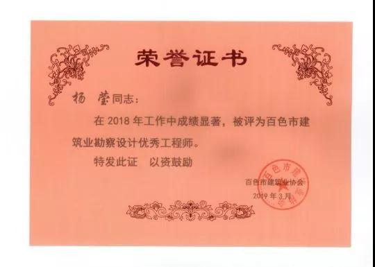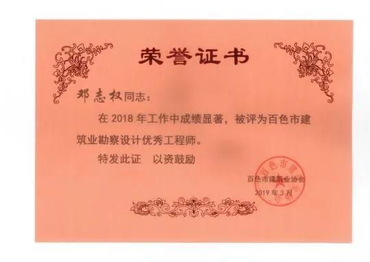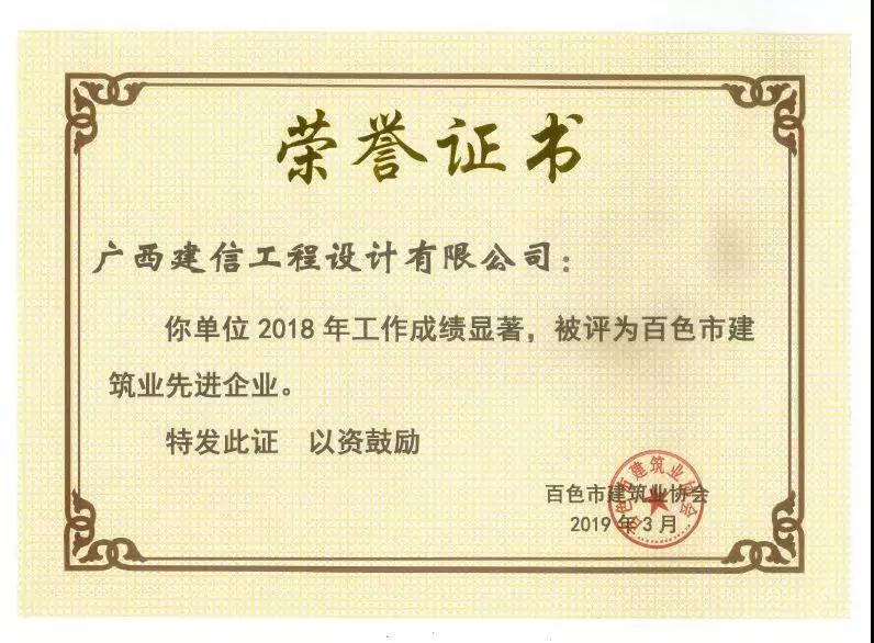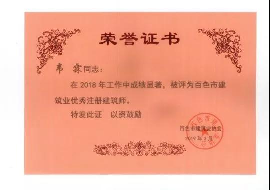 四、廣西建信工程設(shè)計有限公司榮獲《2018年度百色市建筑業(yè)先進企業(yè)》、韋霖榮獲《2018年度百色市勘察設(shè)計優(yōu)秀注冊建筑師》、劉劍榮獲《2018年度百色市勘察設(shè)計優(yōu)秀注冊結(jié)構(gòu)師》、楊瑩、鄧志權(quán)榮獲《2018年度百色市勘察設(shè)計優(yōu)秀工程師》的榮譽稱號。
