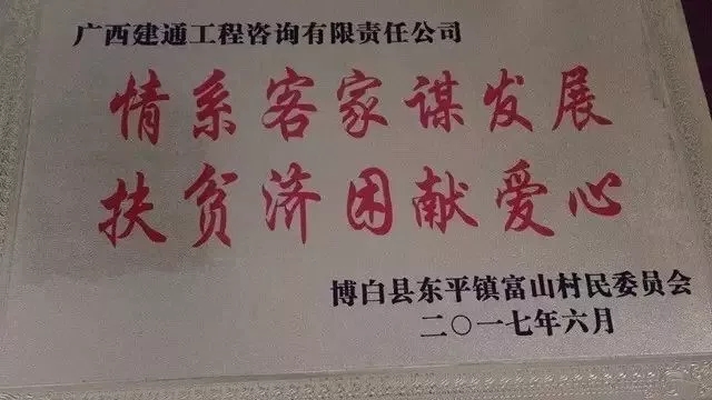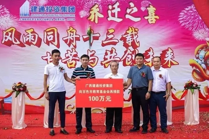 在企業(yè)發(fā)展壯大的同時,集團積極履行企業(yè)社會使命,以感恩的心回報社會,累計捐款捐物達550多萬元,其中向百色市教育基金會捐款200萬元,成立百色中學(xué)及樂業(yè)中學(xué)建通助學(xué)班。鑒于建通投資集團對百色市教育事業(yè)的貢獻,集團鄧董事長于2017年當選為百色市教育基金會榮譽會長。