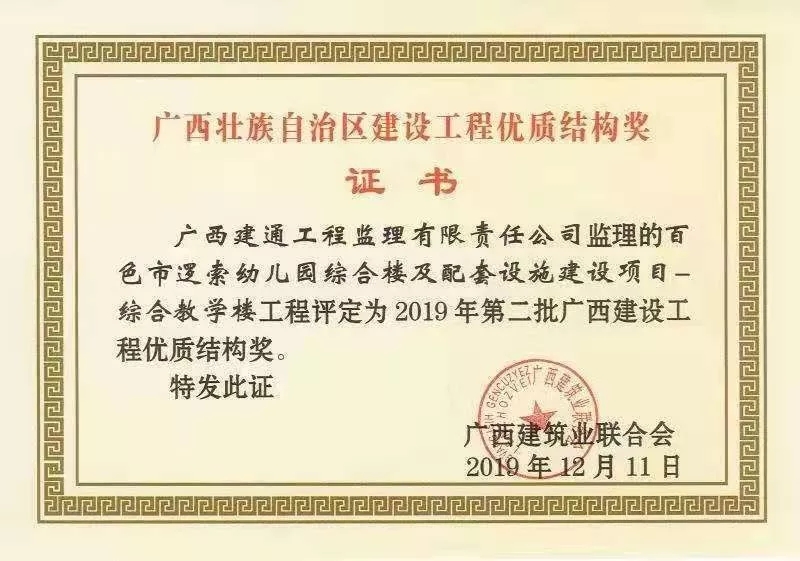 我集團(tuán)子公司承接的《百色市邏索幼兒園綜合樓及配套設(shè)施建設(shè)項(xiàng)目-綜合教學(xué)樓》項(xiàng)目被授予2019年第二批廣西壯族自治區(qū)建設(shè)工程優(yōu)質(zhì)結(jié)構(gòu)獎(jiǎng)稱(chēng)號(hào)。