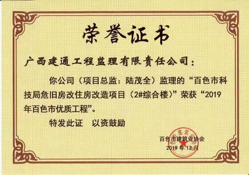 我集團(tuán)子公司承接的《百色市科技局危舊房改住房改造項(xiàng)目(2#綜合樓)》項(xiàng)目榮獲了2019年百色市優(yōu)質(zhì)工程稱(chēng)號(hào)。