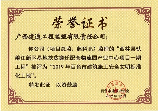 我集團(tuán)子公司監(jiān)理的《西林縣馱娘江新區(qū)易地扶貧搬遷配套物流園產(chǎn)業(yè)中心項(xiàng)目一期工程》項(xiàng)目榮獲2019年(第四批)百色市建筑施工安全文明標(biāo)準(zhǔn)化工地稱(chēng)號(hào)。