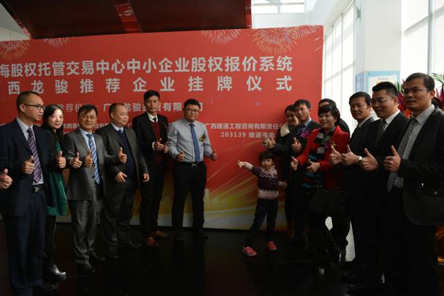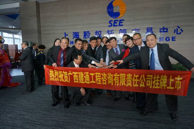 2014年12月30日上午,上海股權(quán)托管交易中心廣西企業(yè)專場(chǎng)掛牌儀式在上股交大廳隆重舉行,由廣西博智融投資產(chǎn)管理有限公司推薦的廣西建通工程咨詢有限責(zé)任公司(代碼:203139)與其它四家廣西優(yōu)秀企業(yè)成功登錄上海股交中心中小企業(yè)股權(quán)報(bào)價(jià)系統(tǒng)。集團(tuán)董事長(zhǎng)鄧安杰攜夫人黃雪冰、愛女鄧思羽、集團(tuán)常務(wù)副董事長(zhǎng)羅程、集團(tuán)副董事長(zhǎng)黃樹威、集團(tuán)副總裁謝乃鵬、劉忠志、蒙建勛、羅 杰、黃承理、蘇勇、李正琦、總裁助理李瑜等集團(tuán)領(lǐng)導(dǎo)及部分董事、高管出席掛牌儀式。集團(tuán)公司用跨越式的發(fā)展思路給公司未來的發(fā)展送上了新年禮物!