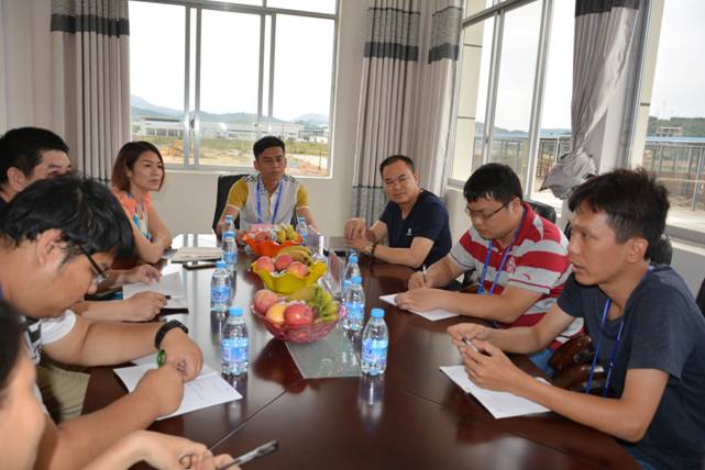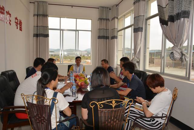圖一:集團副董事長黃樹威、集團副總裁黃承理、董事會秘書處綜合三部主任覃艷妙、檢測公司副總經(jīng)理覃佳倫傾聽檢測公司員工做工作匯報